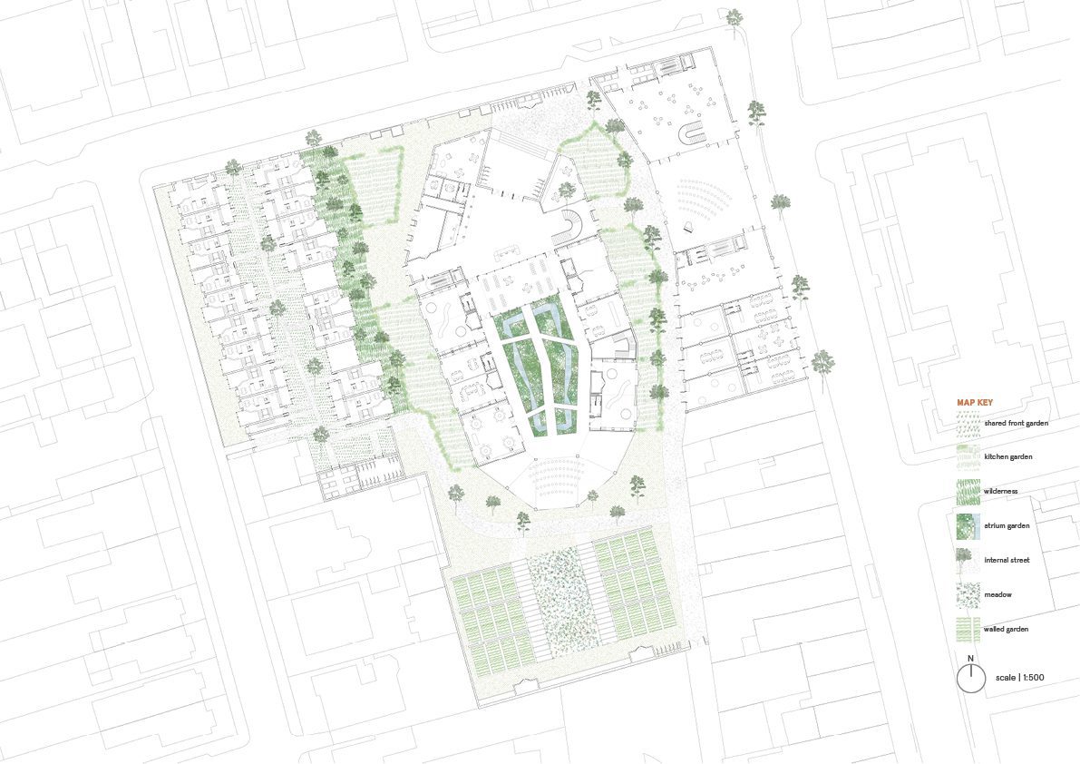 The buildings sit in a varied landscape that provides different experiential spaces across the site.There are seven landscapes across the site: the shared front garden, the wilderness, the kitchen garden, the internal garden, the internal street, the walled garden and the meadow. Each one has different characteristics and degrees of privacy.