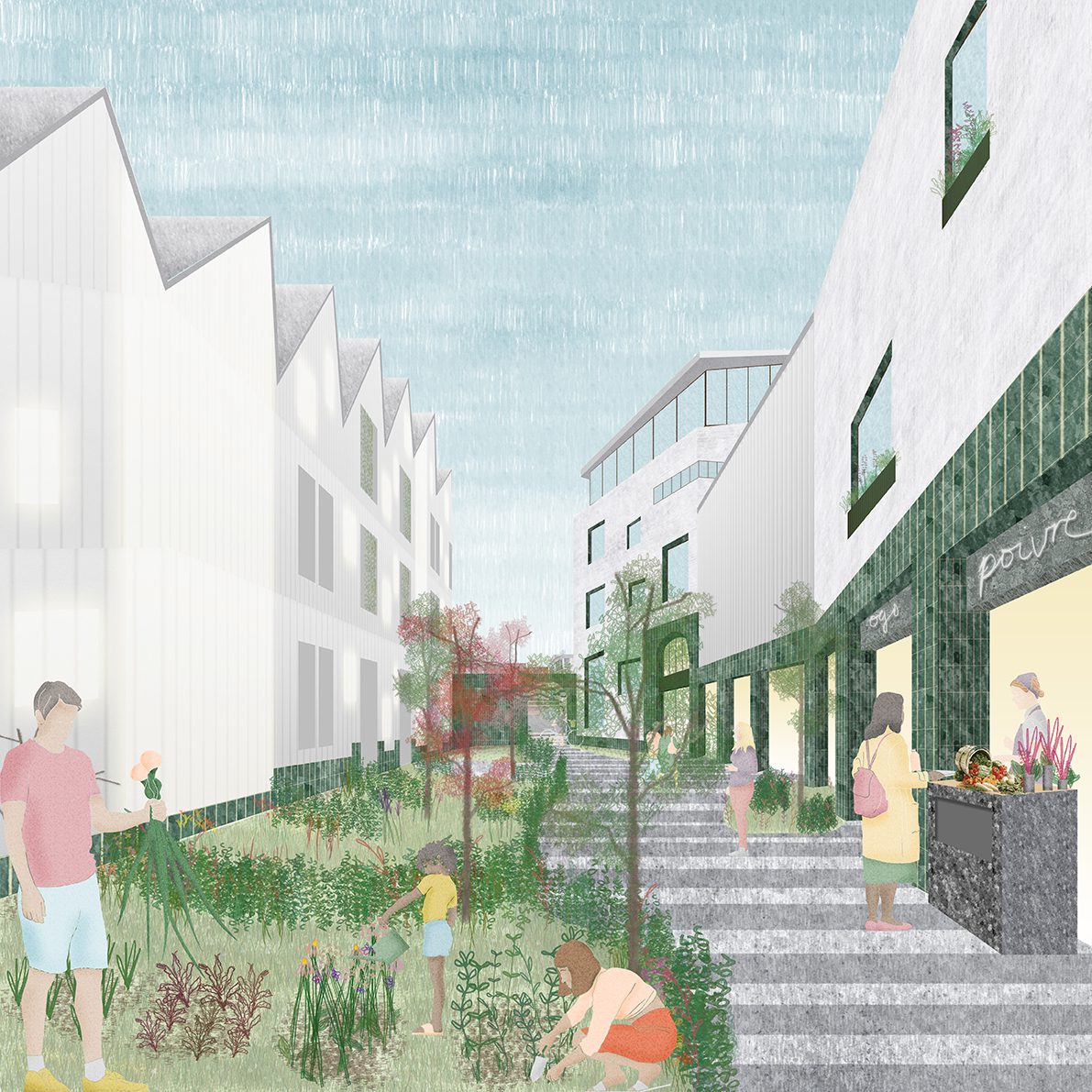 A new collection of buildings – including a school, community building and housing – are linked by a series of interwoven landscapes, and serve a wide sector of society with a food and agricultural based programme. A school sits as the centrepiece of the masterplan – a pristine, crystalline object in a hazy and varied landscape. The buildings will be linked by a garden wall.