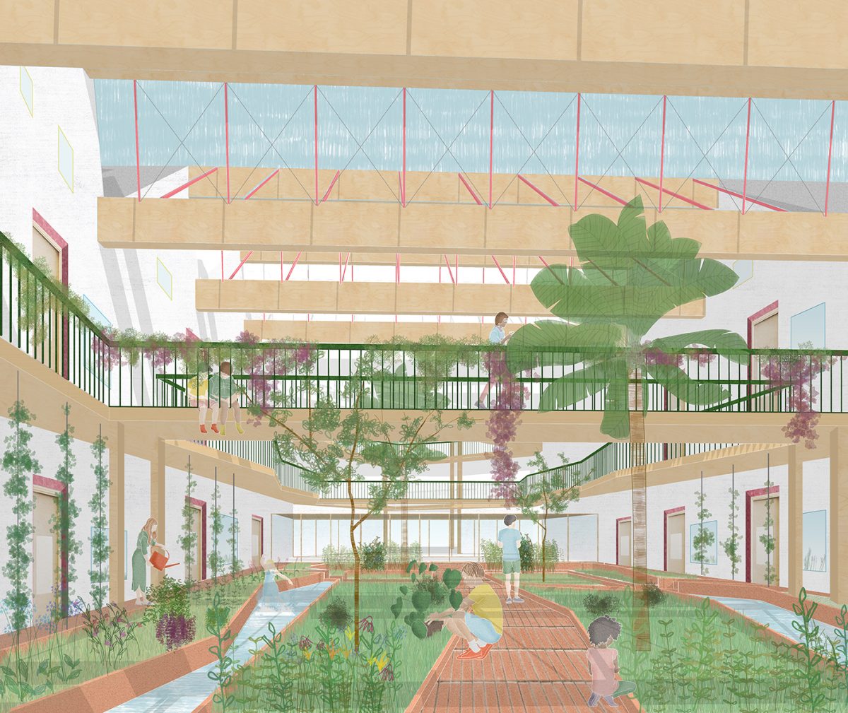 The internal garden is a verdant, Eden-like space at the heart of the school – a public square within the building with façades that make a town square.