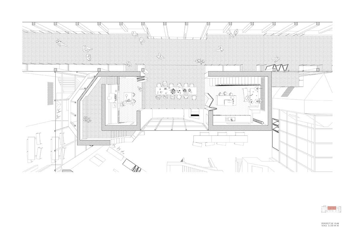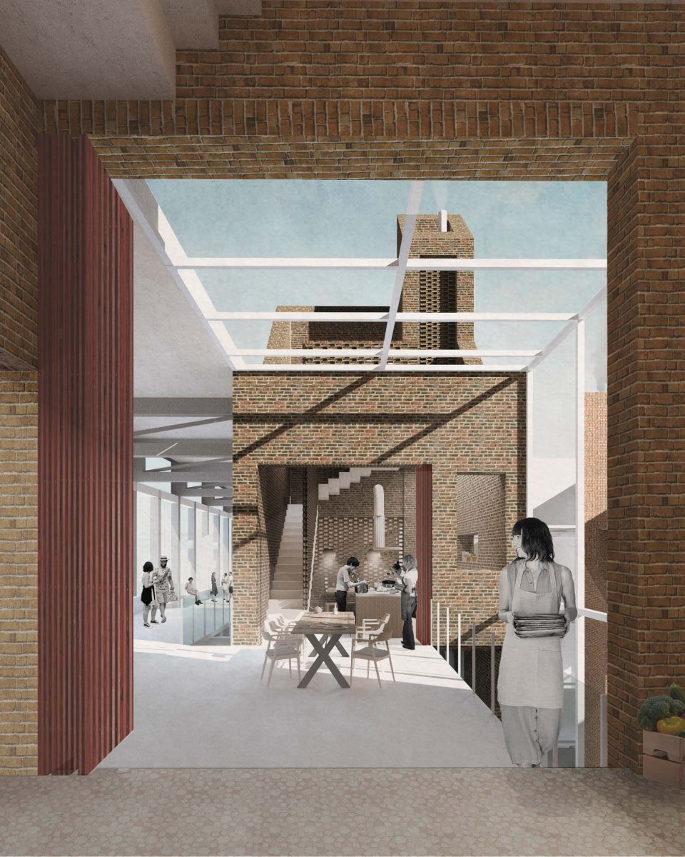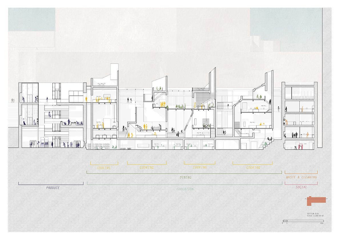 The combination of an open public courtyard and a variety of private and shared kitchen spaces facilitates growing, cooking and dining experiences for a range of users and occasions. A ramped circulation route offers glimpses into pockets of activity while circling the heart of the building. Supporting utility spaces take visitors and residents on a journey of food, from plant to plate.