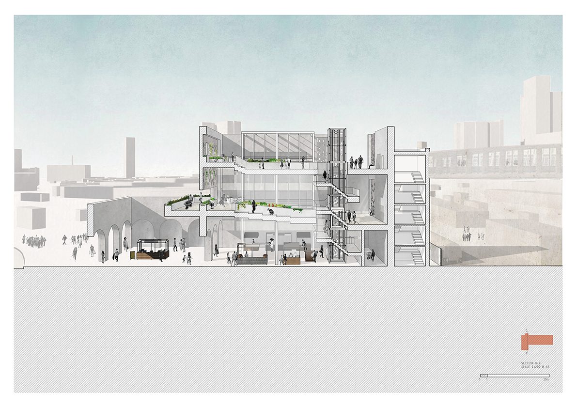 A massive open air concrete block houses the growing and retail functions of food produce, beginning the user’s experience as well as the food’s journey from plant to plate.