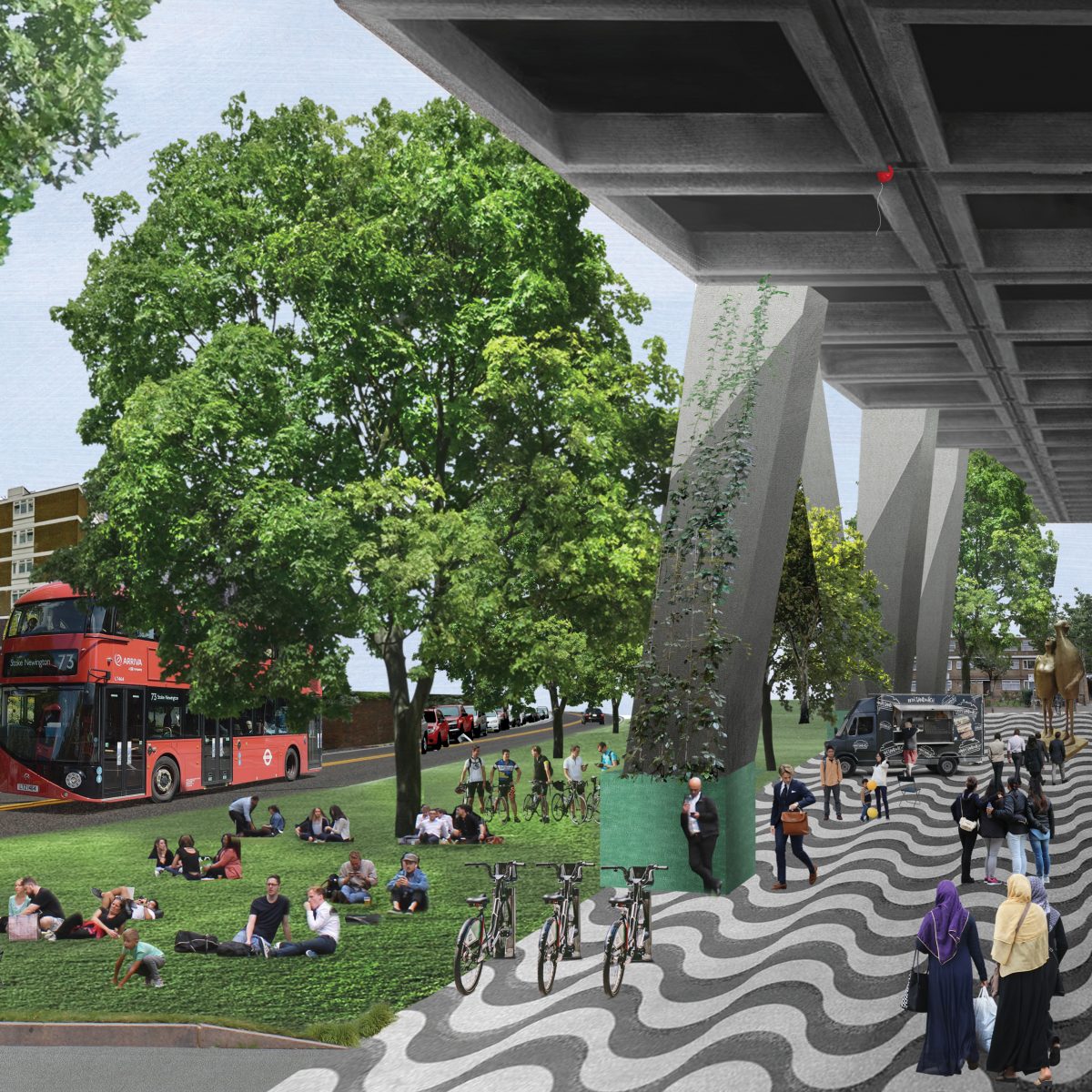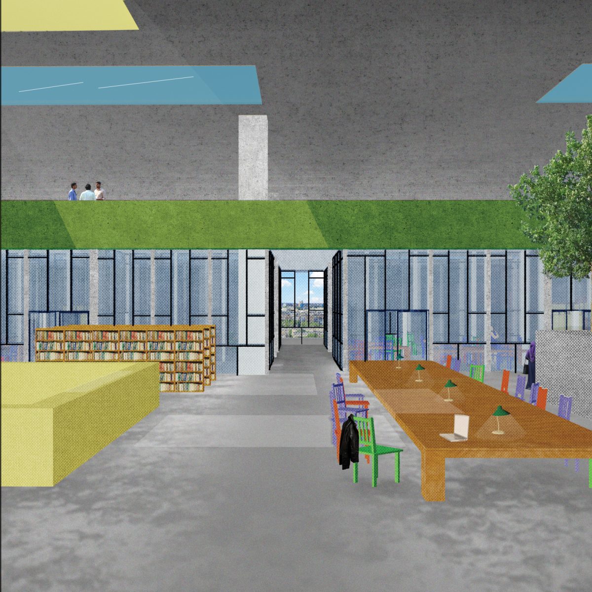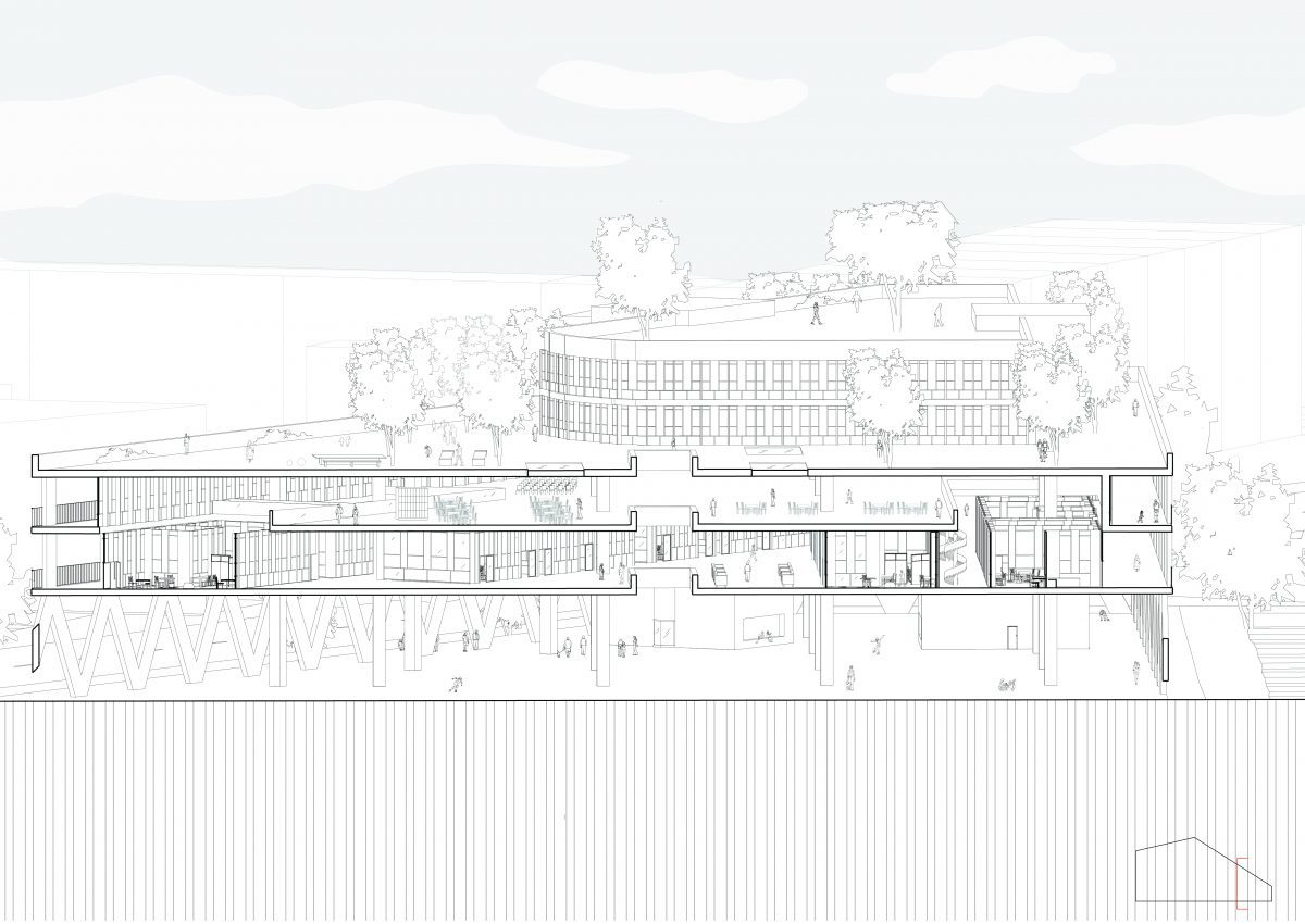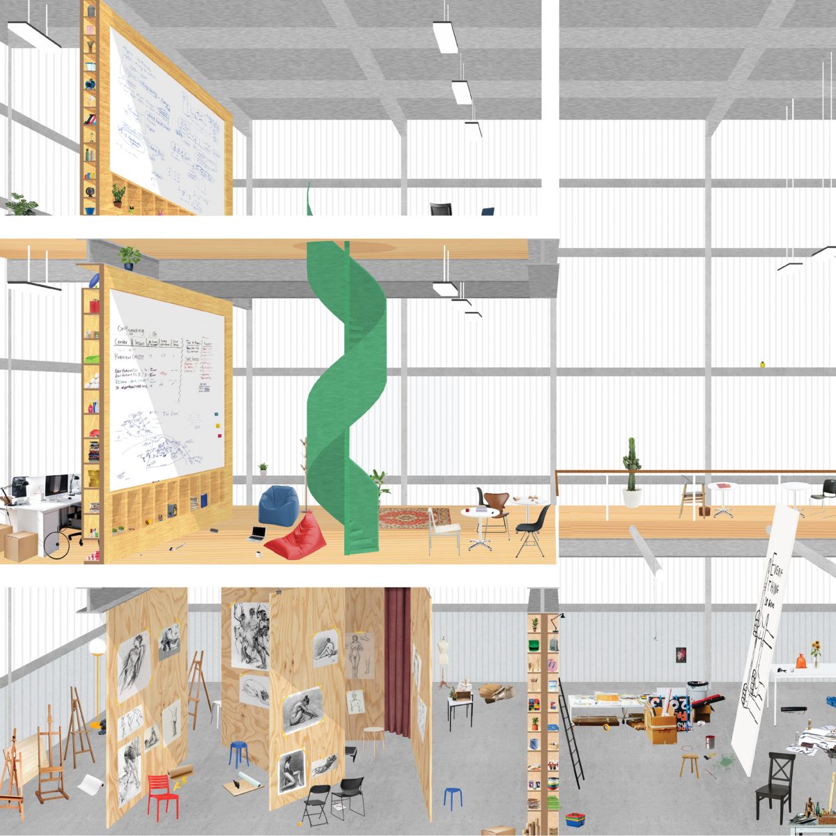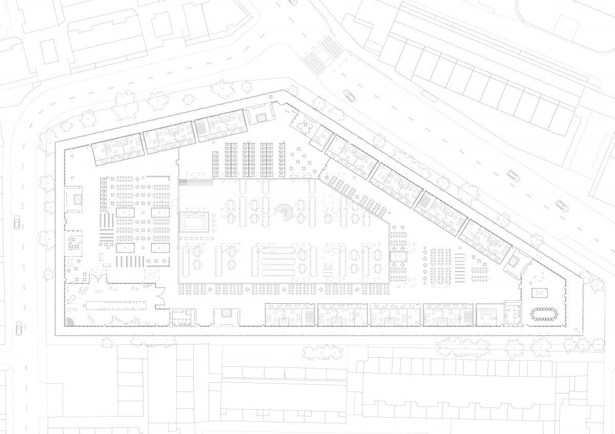 Conserving the existing perimeter trees of St.John’s Park, establishing navigation with eight cores and replacing the middle with artwork, public kitchen and vast amounts of future-proof space.