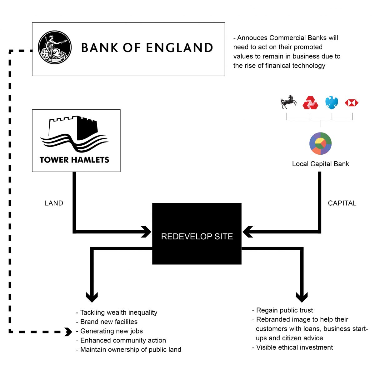 Local Capital proposes a radical reimagining of banks’ interaction with its customers, where your money is invested into vital space for business-start ups and other services where you can go to get financial advice and support.