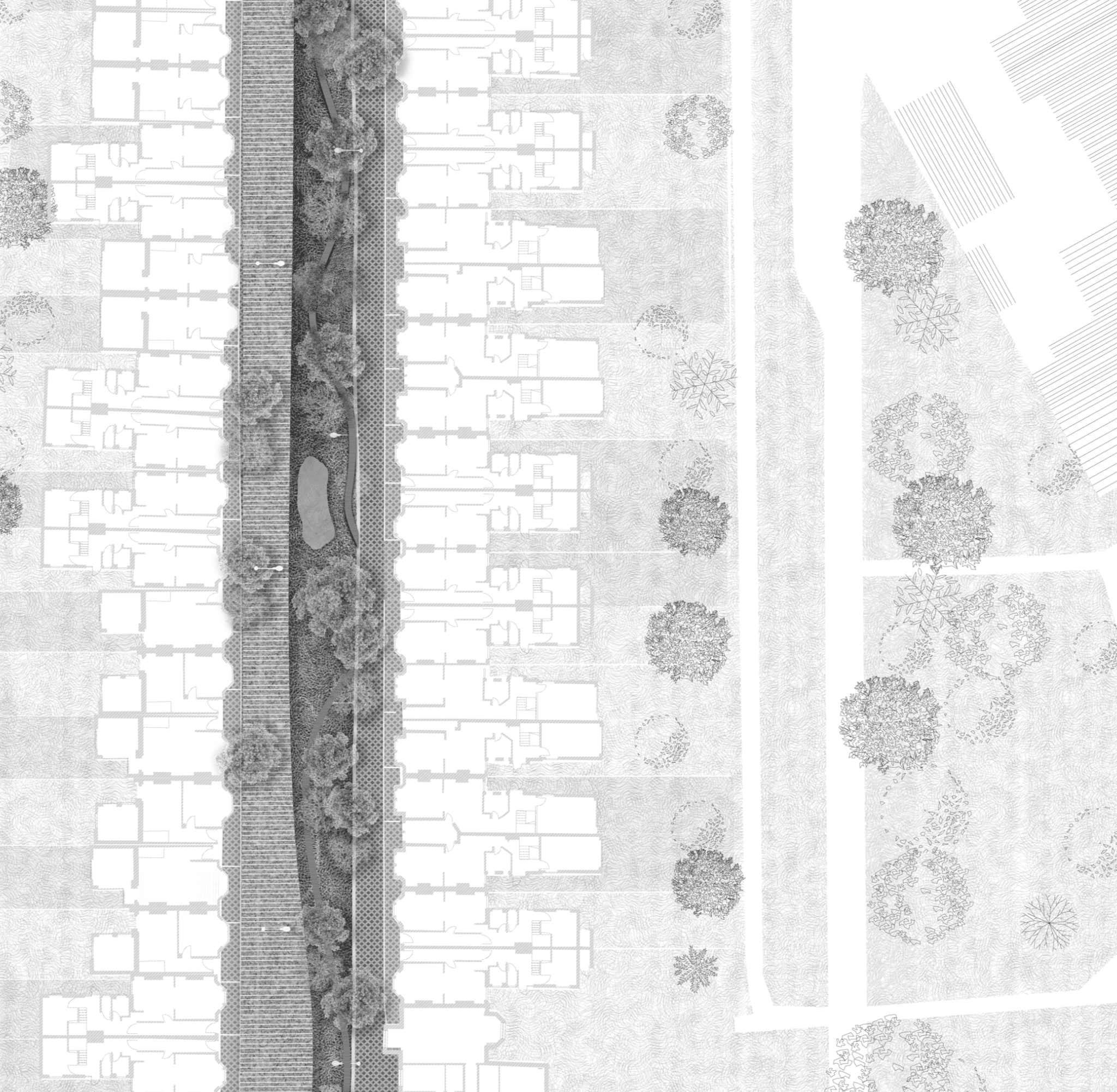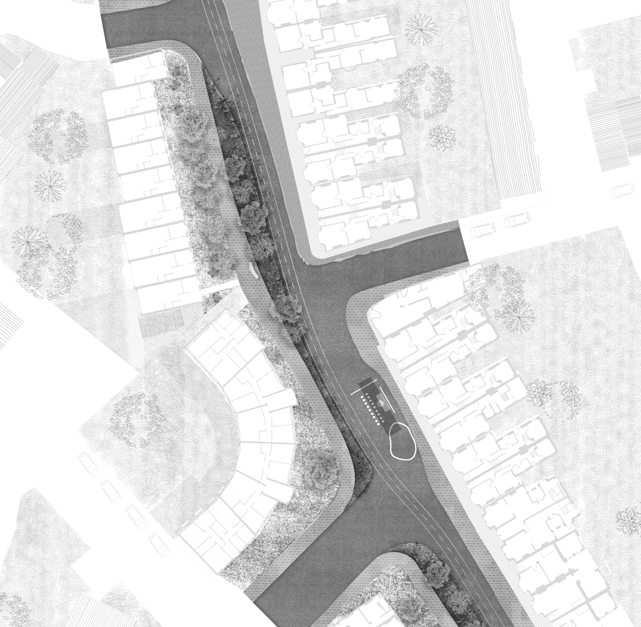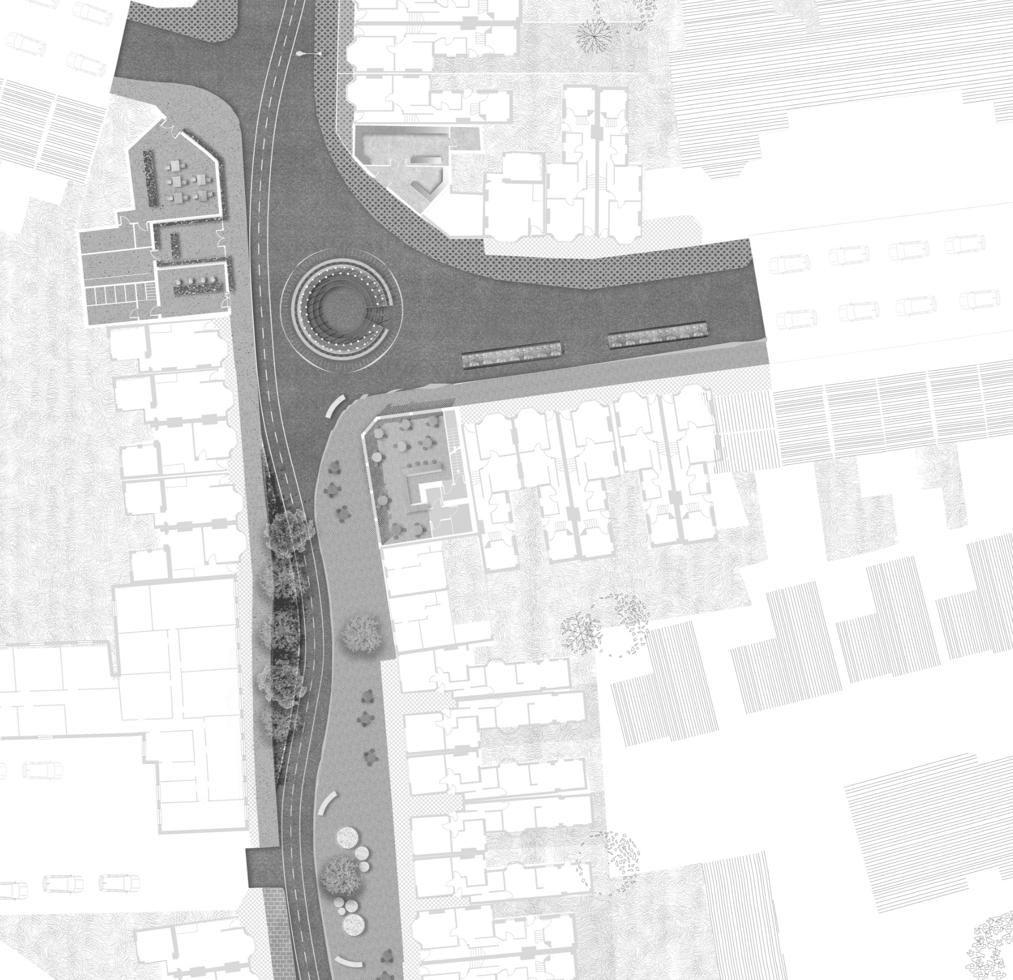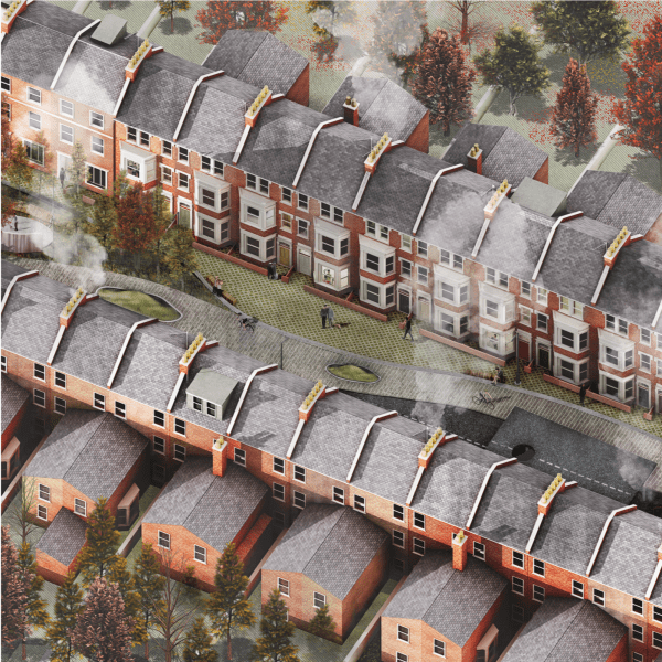 Here, current student Tom Badger’s objective is to imagine a future where car use is declining and residential streets are reclaimed for communities, allowing safer cycle routes, more access to green space, and inserted amenities – such as a theatre – that offer greater opportunities for social connection.