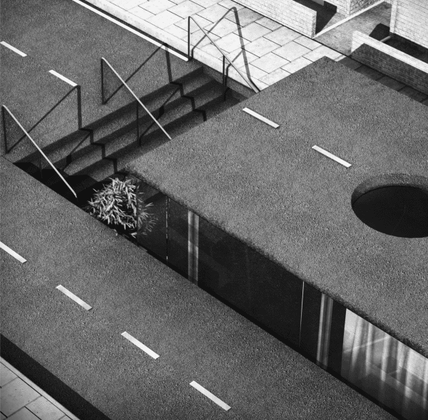 The second stage lifts a slab of road into the air to provide space for a small theatre. The theatre references the modernist dreams of invisible columns and floating planes, with the roof of the pavilion floating on slender columns. A small performance space is then dug into the ground. The roof of the theatre sits 1500mm above the road surface, in so as not to be overly intrusive on the outlook of the street. Grassy mounds act as speed bumps sitting on the granite-paved area open slowing the speed of cyclists and creating a space that can be used by pedestrians and cyclists.
