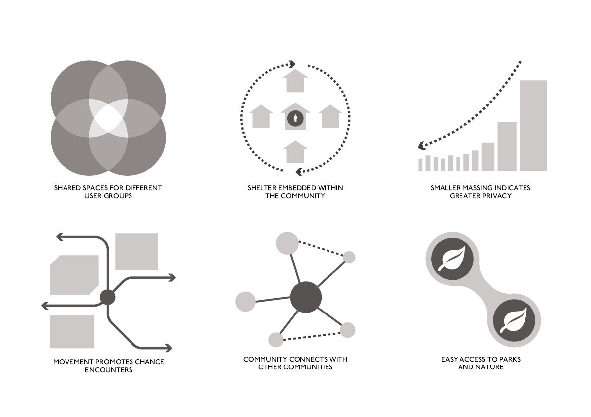 The masterplan was designed using these key principles. Reducing stigmatisation and ostracisation for homeless individuals was a priority, therefore a strategy involving the mixing of different user groups was essential.