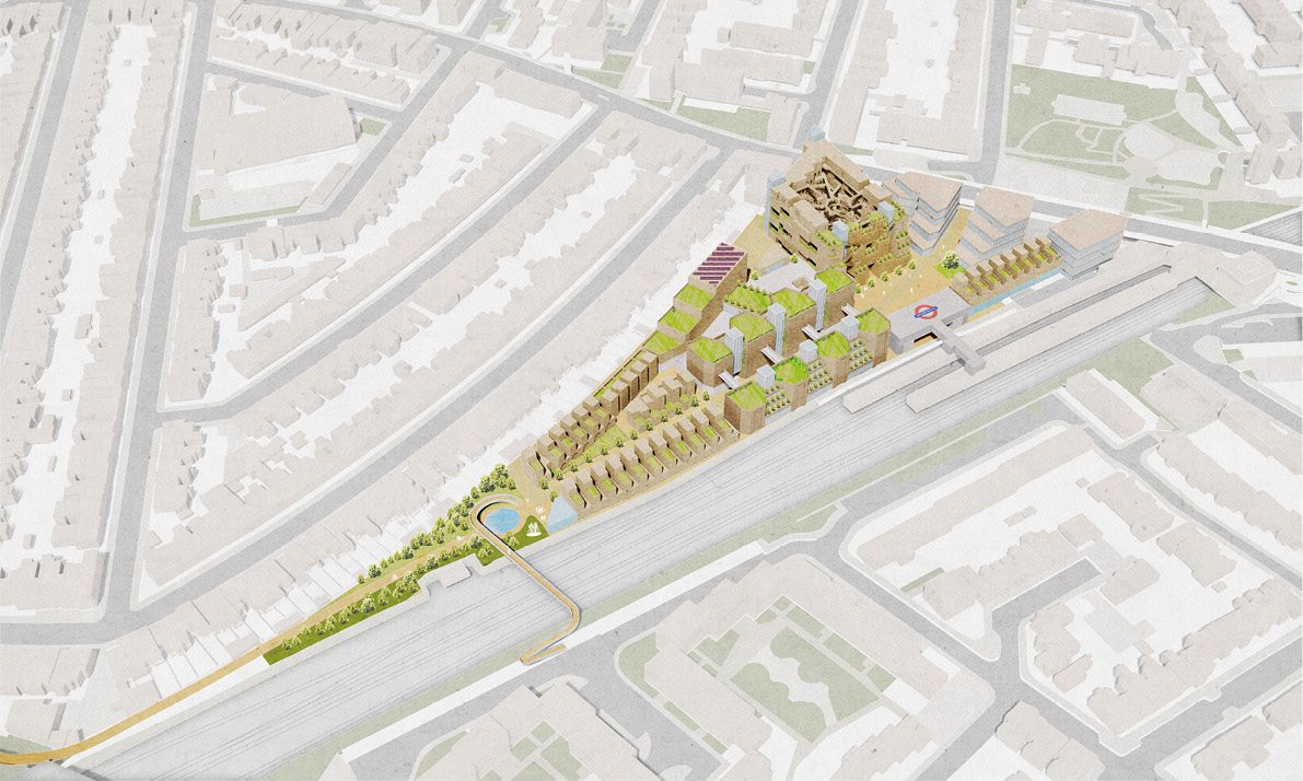 Public-facing uses including a new entrance to Plaistow Station and the shelter are located to the East, with more private residential to the West. Pedestrian and cycle routes connect the site to the Greenway and beyond.