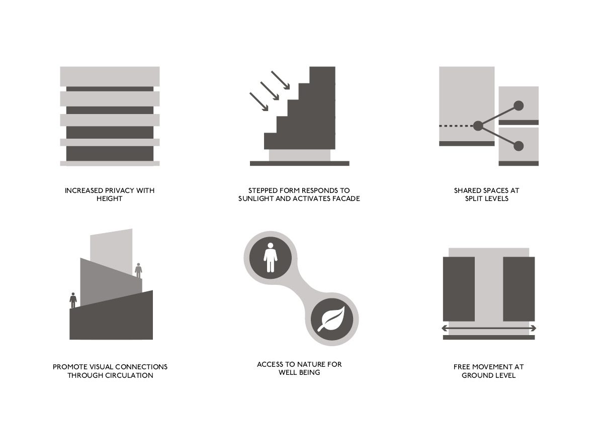 Shared spaces are located in the south facade, with cut-out gardens punching though. The rest of the building houses residents, with use groups becoming more private with greater height.