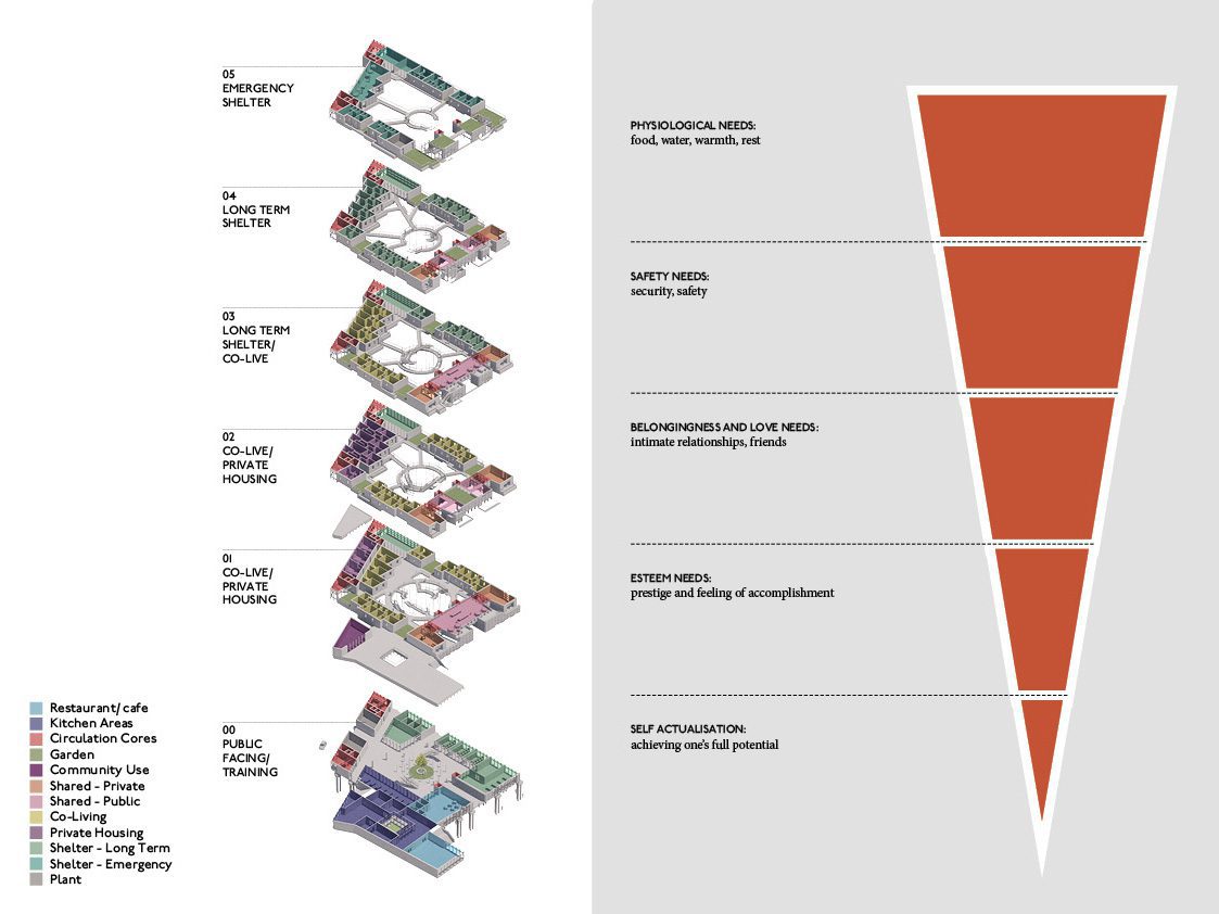 The building can be viewed as a reversal of Maslow’s Hierarchy of Needs. Those most in need begin at the top and work their way down towards a stable future.