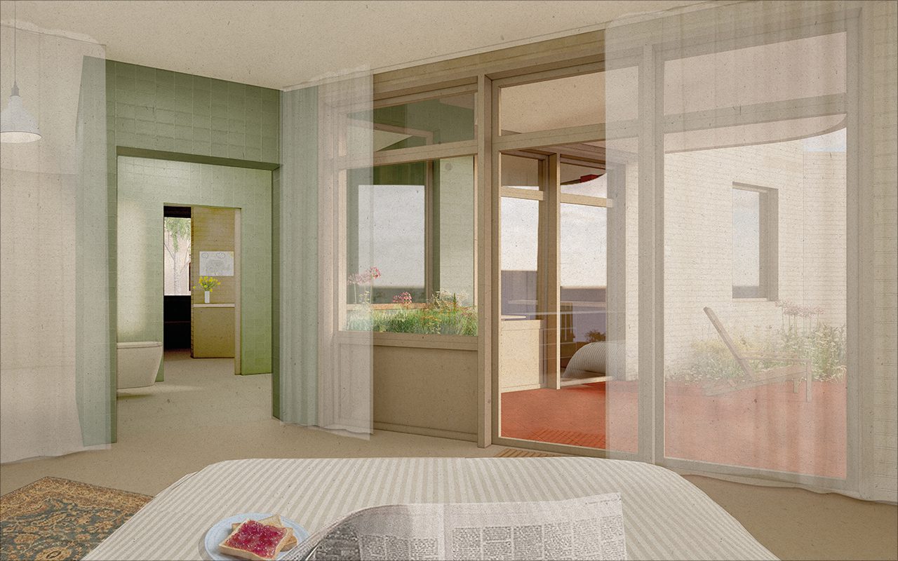 “Ellie deftly managed a highly sensitive topic which had a personal resonance, with a methodical approach which gave her the critical distance to be very experimental and have a grounded response. Her work was special in not limiting drawing a project from a thesis question but developing a rigorous design methodology based on a spatial issue drawn specifically from her research on Alzheimer: perception of space. Her architectural resolution revealed a sensibility, showing us that she was not only employing a method, but imbuing a warm sensibility to this new suburban block. Weaving rigour and warmth, her project offers an uplifting promise for new types of living for a vulnerable group which are not represented in traditional care architecture.”