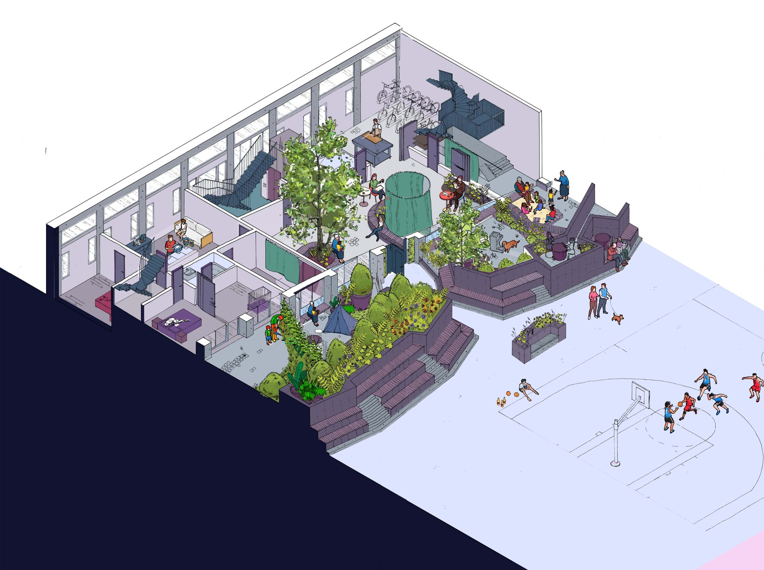 The ground floor hosts the shared utility, workspace and creches. Designed to allow people to work from home and meet others from the block.