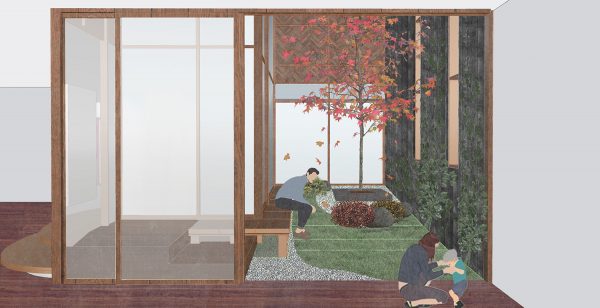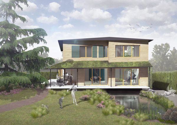 We want to connect with nature not just in the morphology of the architecture, but also with the use of local and natural materials: we’re using bricks that are made of soil from the site, and we will paint the walls with clay that will naturally control the humidity inside the house. The green roof will increase the architecture biodiversity and donate a soft view from the bedroom’s windows on the first floor. Again, the green roof is an essential moment of exchange between nature and architecture, allowing green as bees and butterflies to find the right environment for them. By creating in-between spaces that expand the inside/outside boundary concept, we are able to meet the needs of the family as well as the other living beings. The house seats happily in its site also with the introduction of a natural pond and a wild garden.