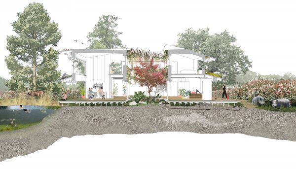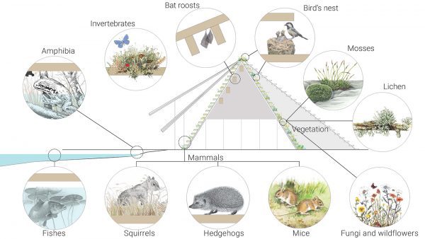 Multi Species architecture: Our proposal for the new Visitor Centre building aims at creating harmony with the surrounding nature in a two ways integration. On one hand, the building engages with the surrounding space by opening itself toward the outside, the lake and the nature, through a large outdoor Lake Terrace and an outdoor studio to the north.