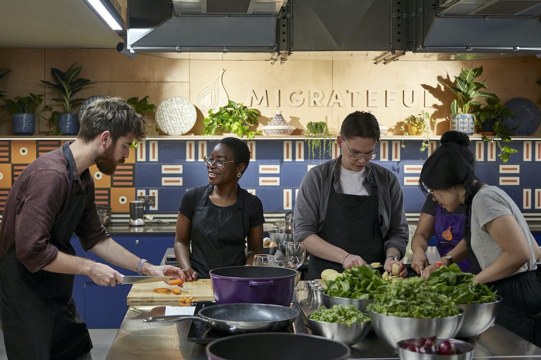 Our Migrateful Kitchen project (2021) transformed a former classroom space in Islington into a new cookery school and venue for Migrateful, a charity delivering classes led by refugees, asylum seekers and migrants struggling to integrate and access employment. Migrateful’s approach is to teach refugees how to run group cooking classes which in turn generates revenues for both the teachers and the charity. The cooking classes have three important components: the telling of the teacher’s story, the celebration and cooking of food from their native country, and the coming together of the teacher and participants to eat the food they have prepared.