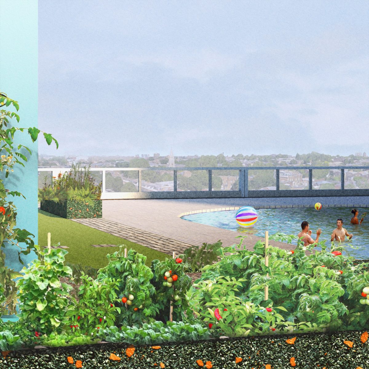 Robin Chatwin – Public Luxury The apparent excess of a rooftop pool is contrasted with the primitive growing of vegetables.